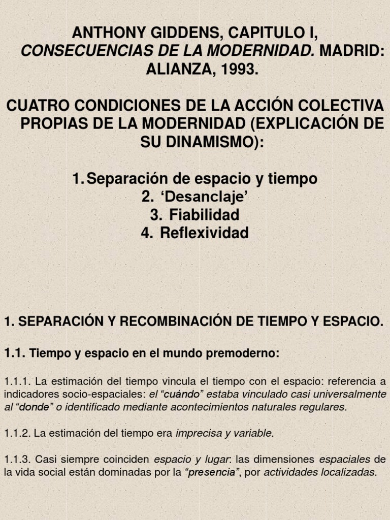 3 1 separación tiempo y espacio es sabido sostiene giddens que en las culturas premodernas el tiempo está vinculado siempre a indicadores socio espaciales. Noticiario con la información. Las sociedades tradicionales o premodernas se basan en relaciones que están muy arraigadas o incrustadas en el tiempo y en el espacio.